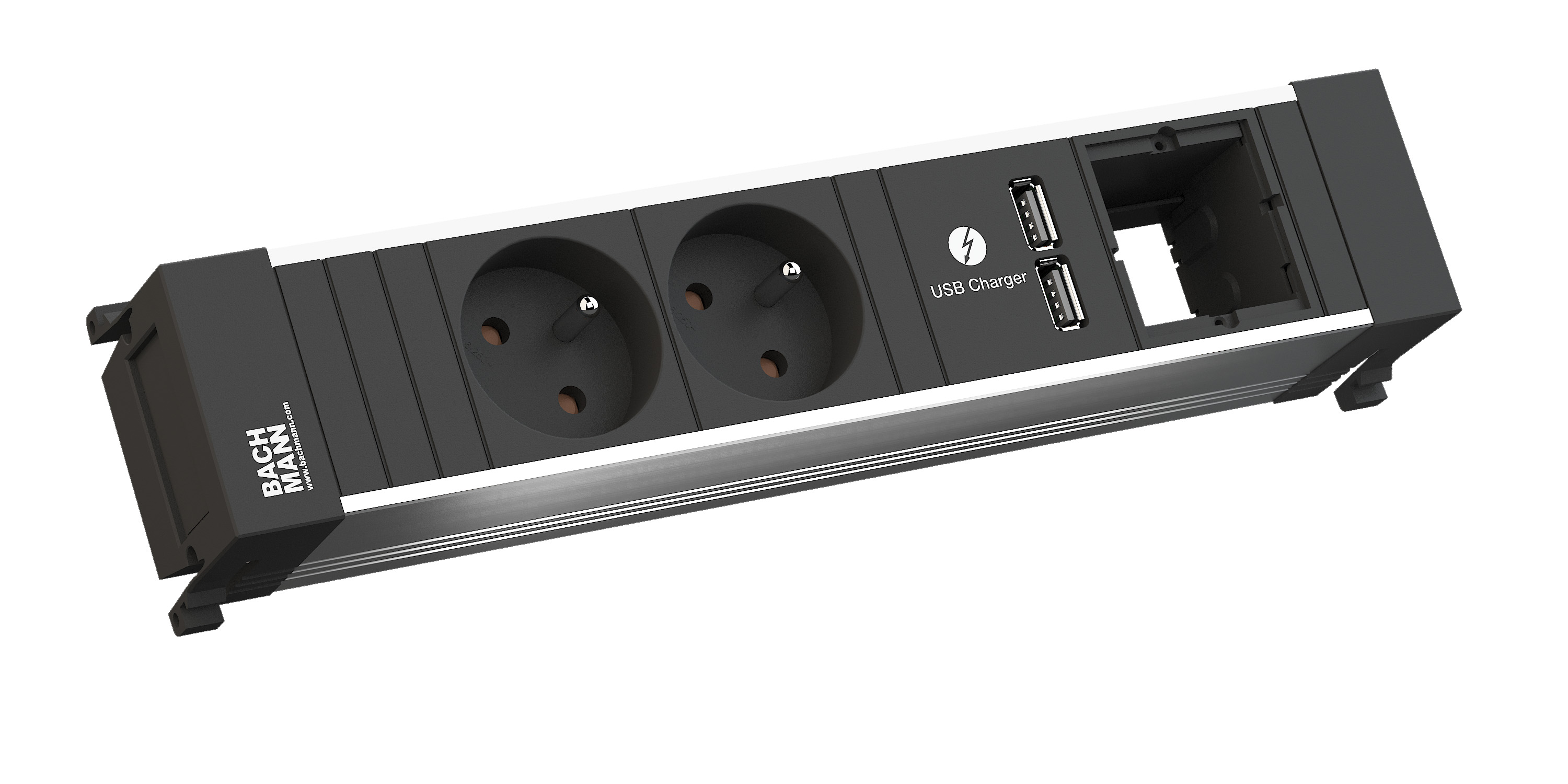 916.0411 Unité a tiroirs POWER FRAME2x230V 35° 1x chargeur usb 1x module utilisateur 0,2m H05VV-F3G1,5mm2, GST18i3, aluminium/noir