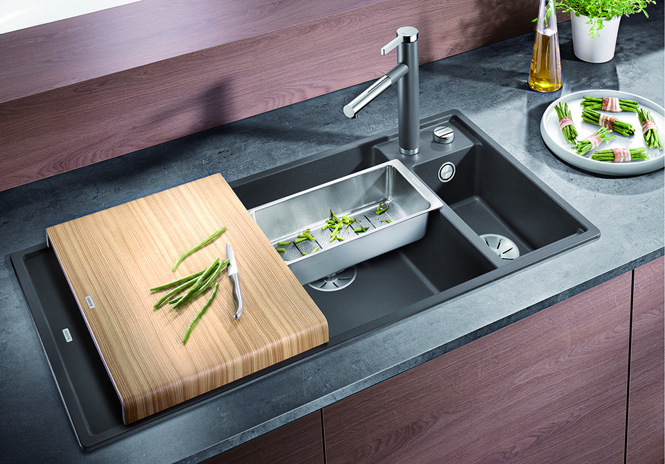 AXIA III 6 S anthracite InFino avec excentrique, accessoires planche a découper en bois, accessoires bol en acier inoxydable, évier a De