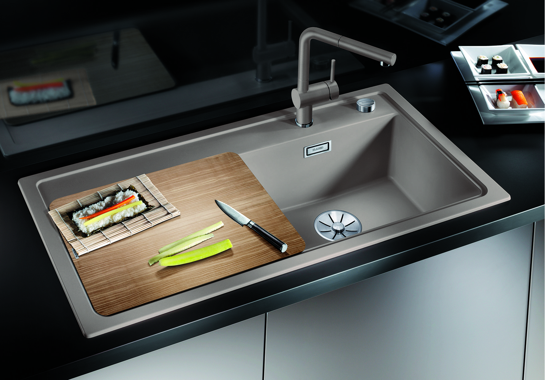 ZENAR XL 6S café InFino avec excentrique, accessoires plaque a découper en bois évier a droite