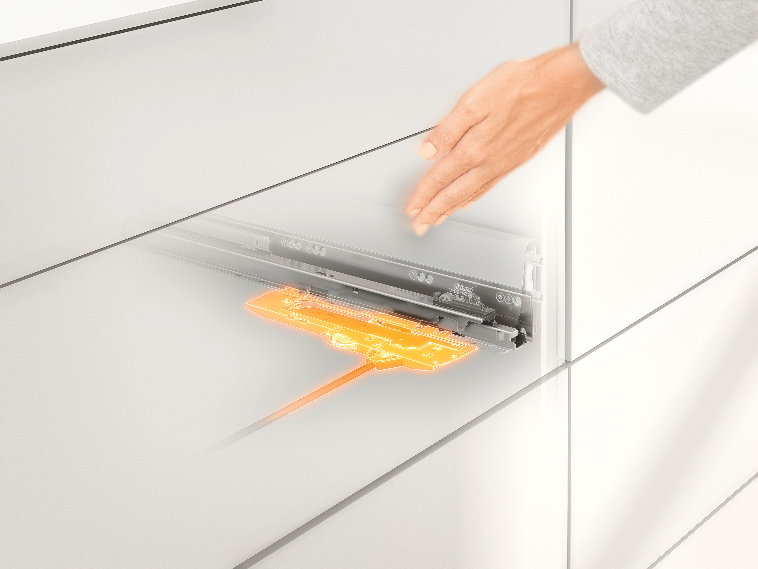 Moulure de corps optimisée Tandembox destinée pour TIP-ON Blumotion - pour ouverture mécanique sans poignée et amortissement lors de la fermeture. Capacité dynamique 30 kg. Doit etre complétée par le module TBX TOB (selon la profondeur et le poids total du tiroir), éventuellement par une synchronisation.