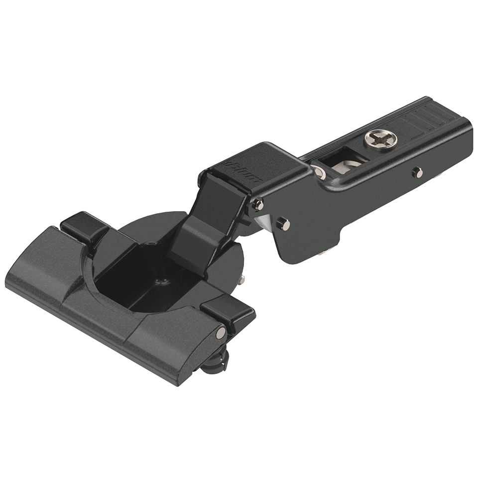 Charniere semi-encastrée sans ressort pour Tip-on. Angle d'ouverture 110°. Montage de la coupelle Inserta (a serrage rapide). Couleur Onyx noir.