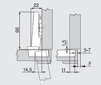 Charniere destinée aux portes épaisses et profilées, angle d'ouverture 95°, avec Blumotion intégré (avec possibilité de désactivation). NE PEUT PAS etre combinée sur une meme porte avec 12060 (71T9550). Les cales sont identiques a celles des Clip Blum existantes – par exemple 12312.
