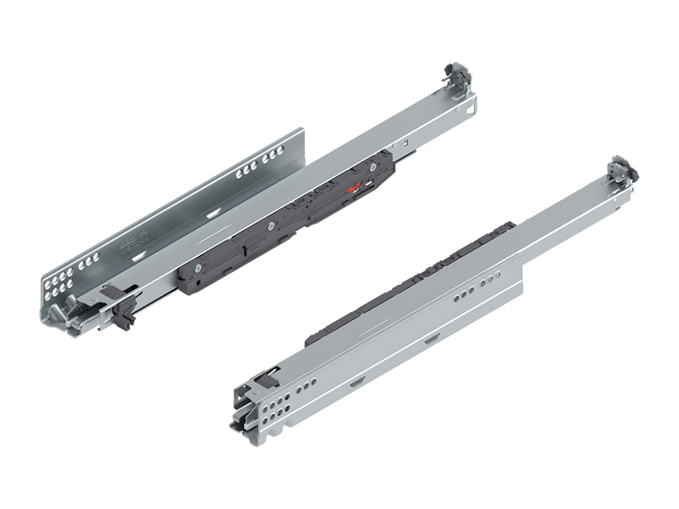 Le tiroir coulissant MOVENTO BLUMOTION S est conçu aussi bien pour un tiroir amorti que pour une version sans poignée avec TIP-ON BLUMOTION. L’amortissement de base BLUMOTION est déja intégré dans le systeme, mais lors de la réalisation avec TIP-ON BLUMOTION, complétez le systeme avec le module approprié en fonction de la profondeur et du poids total du tiroir (y compris la quincaillerie frontale et le contenu du tiroir). Pour le bon fonctionnement du systeme TIP-ON BLUMOTION, il est nécessaire d’ajouter la synchronisation (axe 282277). Il faut toujours compléter par la quincaillerie frontale (159816+159817).
