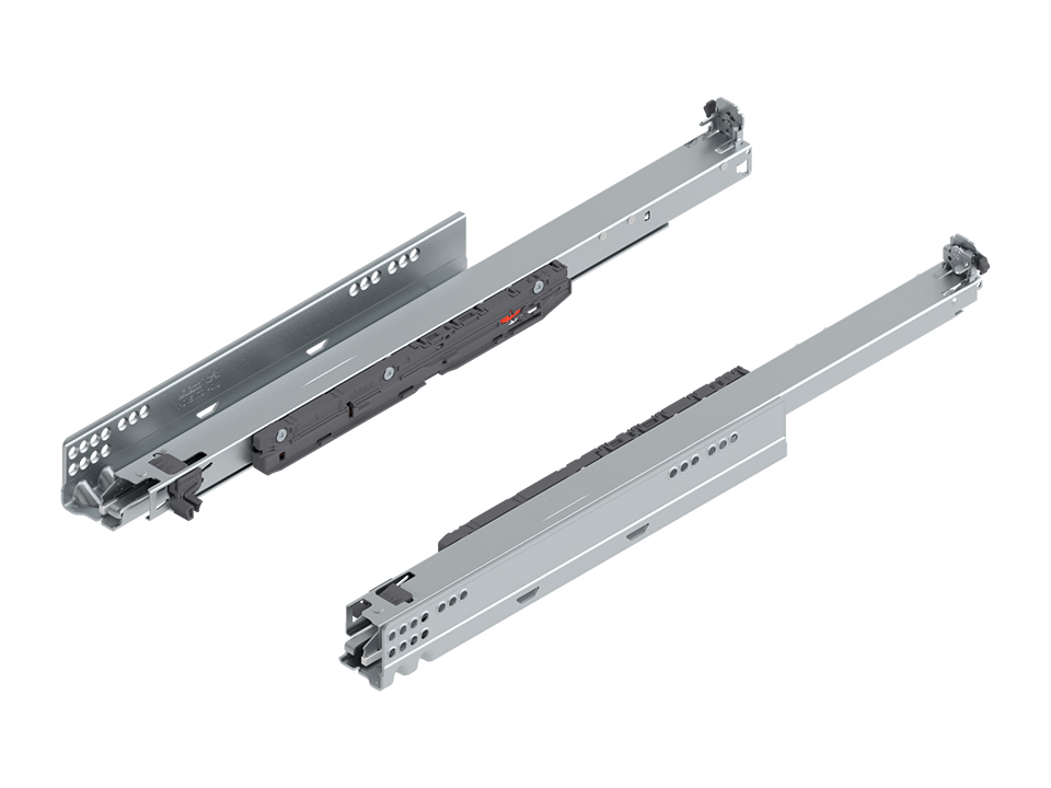 Le tiroir coulissant MOVENTO BLUMOTION S est destiné aussi bien pour un tiroir coulissant avec amortisseur que pour une version sans poignée avec TIP-ON BLUMOTION. L’amortissement de base BLUMOTION est déja intégré dans le systeme, mais en cas de réalisation avec TIP-ON BLUMOTION, complétez le systeme avec le module approprié selon la profondeur et le poids total du tiroir (y compris la façade et le contenu du tiroir). Pour le bon fonctionnement du systeme TIP-ON BLUMOTION, il est nécessaire d’ajouter la synchronisation (axe 282277). Il est toujours nécessaire de compléter avec la quincaillerie frontale (159816+159817).