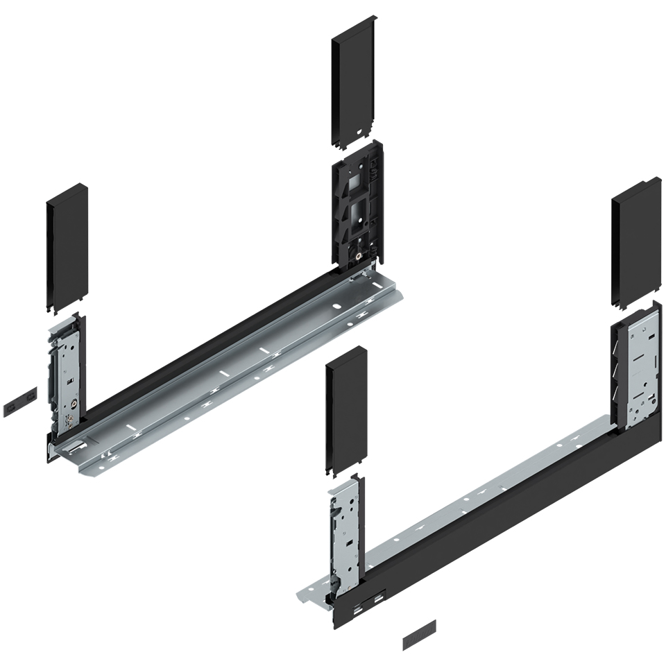 Côté LEGRABOX. Pour tiroir coulissant frontal, fixation avant ZF7C7002 (227547) vis a bois ou ZF7C70E2 (227548) EXPANDO. Fixation arriere ZB7C000S. Tiroir coulissant 750.3501S 40kg (349904) pour version BLUMOTION/TOB ou 750.3501T (227422) pour version TIP-ON.