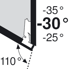 Charniere d'angle -30°. Angle d'ouverture 110°. Amortisseur de butée BLUMOTION a encastrer sur le côté de la charniere 970A1002 - 12398. Plaquettes de base : autres voir catalogue Blum vis a bois 173L6130 - 12304, euro 173L8130 - 12305, réglage excentrique 173H7130 - 12341, expando 174E6130.01 - 12303.