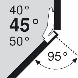 Charniere d'angle +45°. Angle d'ouverture 95°. Amortisseur a cliquer sur le cintre de charniere 973A7480 - 12382. Pour meubles d'angle avec façades encastrées. Plaquettes de base : autres voir catalogue Blum vis a bois 173L6100 - 12306, euro 173L8100 - 12318, réglage excentrique 173H7100 - 12340, expando 174E6100.01 - 12302.
