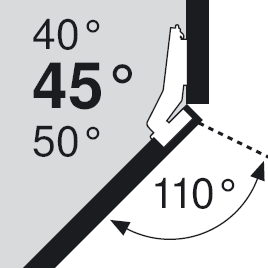 Charniere d'angle +45° II pour armoires d'angle avec façades adjacentes. Angle d'ouverture 110°. Plaques de base : vis a bois 173L6100 - 12306, euro 173L8100 - 12318, Amortisseur de butée BLUMOTION a encastrer côté charniere 970A1002 - 12398. Plaques de base : autres voir catalogue Blum. vis a bois 173L6100 - 12306, euro 173L8100 - 12318, réglage par excentrique 173H7100 - 12340, expando 174E6100.01 - 12302. expando 174E6100.01 - 12302. Pour variante insérée : 175H7190.22 - 12311.