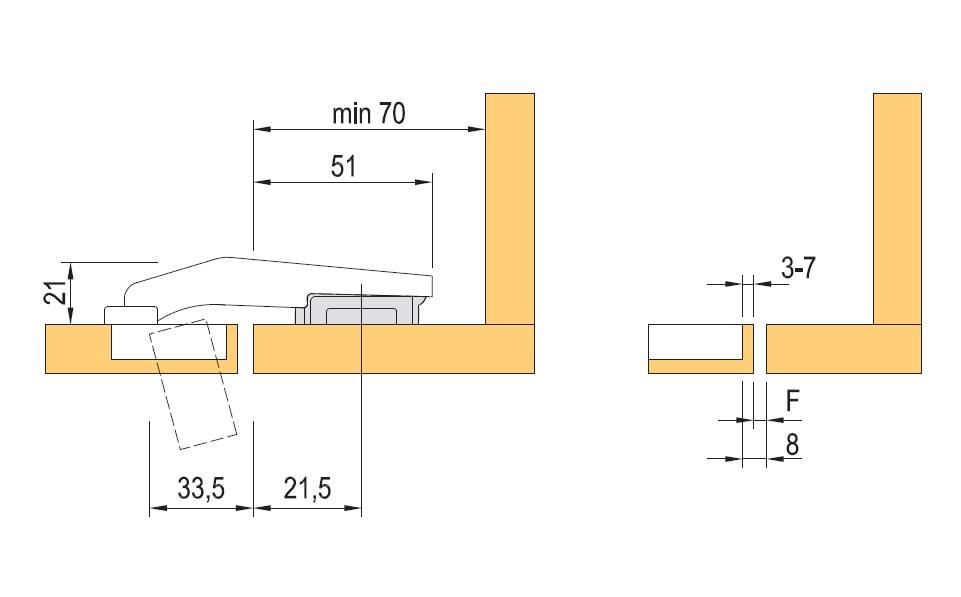 Charniere invisible pour constructions avec angle mort – portes affleurantes au cadre. Fonction de la charniere (Tip-on, Clip-top, Blumotion), méthode de fixation de la cuvette et finition couleur selon le nom du produit. Les charnieres Clip-top (sans amortisseur) peuvent etre équipées d’un amortisseur externe e percer.
