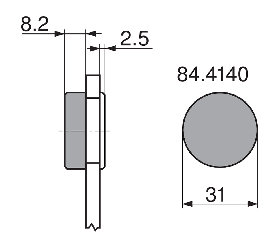 Cache de charniere pour porte en verre. Forme : O. Diametre : 31 mm. Hauteur : 8,2 mm.