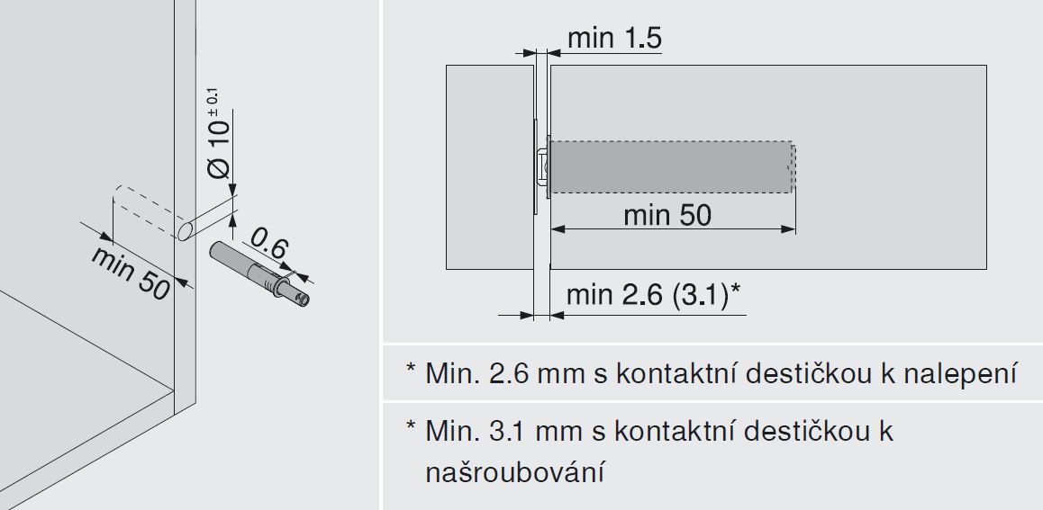 Mécanisme pour charnieres sans ressort. Gris poussiere. Pour porte recouvrante jusqu'a 1300 mm de hauteur. Pour charnieres sans ressort. A encastrer pour trou de 10 x 50 mm. Matériau plastique. Déploiement environ 17 mm. Comprend une plaque de contact a coller et une plaque de contact a visser. Course de réglage +4,0 / -1,0 mm.