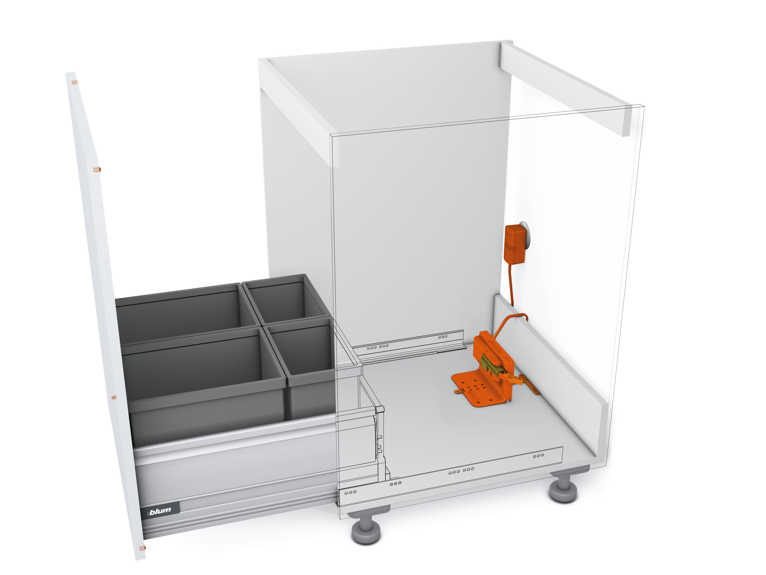 Doit toujours etre utilisé en combinaison avec SERVO-DRIVE pour les tiroirs coulissants/abattants. Pour les tiroirs, il faut utiliser 2 pieces par panneau avant jusqu'a une hauteur de 300 mm, 4 pieces pour les panneaux plus hauts. L'espace de distance entre le corps du meuble et la façade est de 2,6 mm.