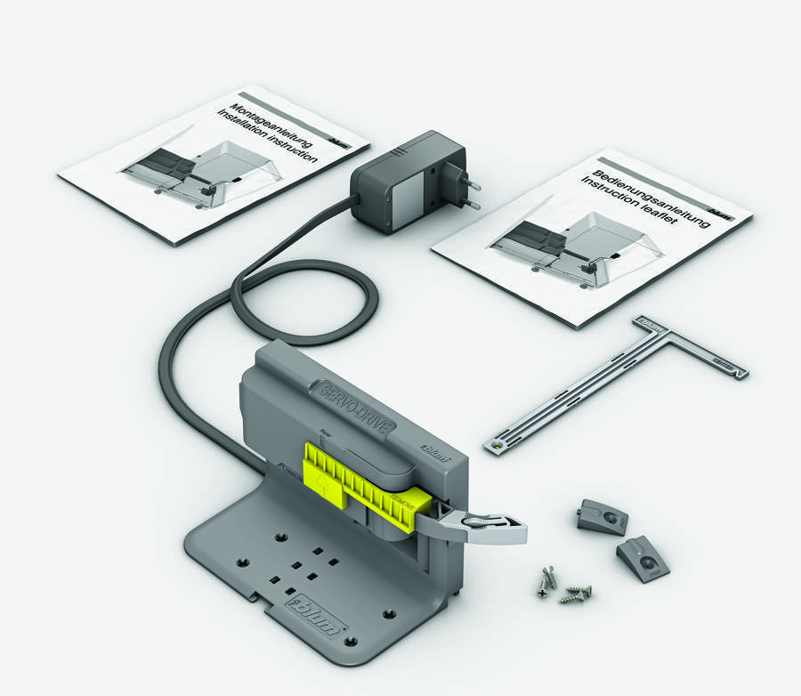 Ensemble complet pour 1 tiroir. Utilisation principalement pour tiroir avec panier a déchets. L'ensemble comprend : support de l’unité servo, guide de montage, unité d'entraînement avec verrouillage de transport/montage, couvercle de transport (= support de distance), protection contre les gouttes d’eau, connecteur pour raccordement secteur, adaptateur, câble 110 cm, outil de montage, butées de distance, vis, mode d’emploi du montage, mode d’emploi. ATTENTION : Il n’est plus possible de connecter d’autres unités a cet ensemble (transformateur) !