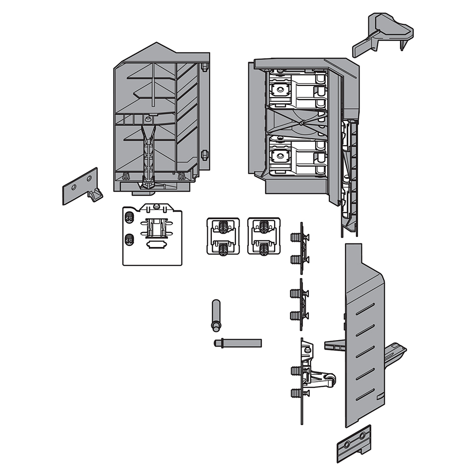 Ensemble de quincaillerie frontale pour la nouvelle version du tiroir d'angle SPACE CORNER avec SYNCROMOTION et façades rabattables. Pour hauteur de tiroir "C". Supports arriere (203291) a ajouter.