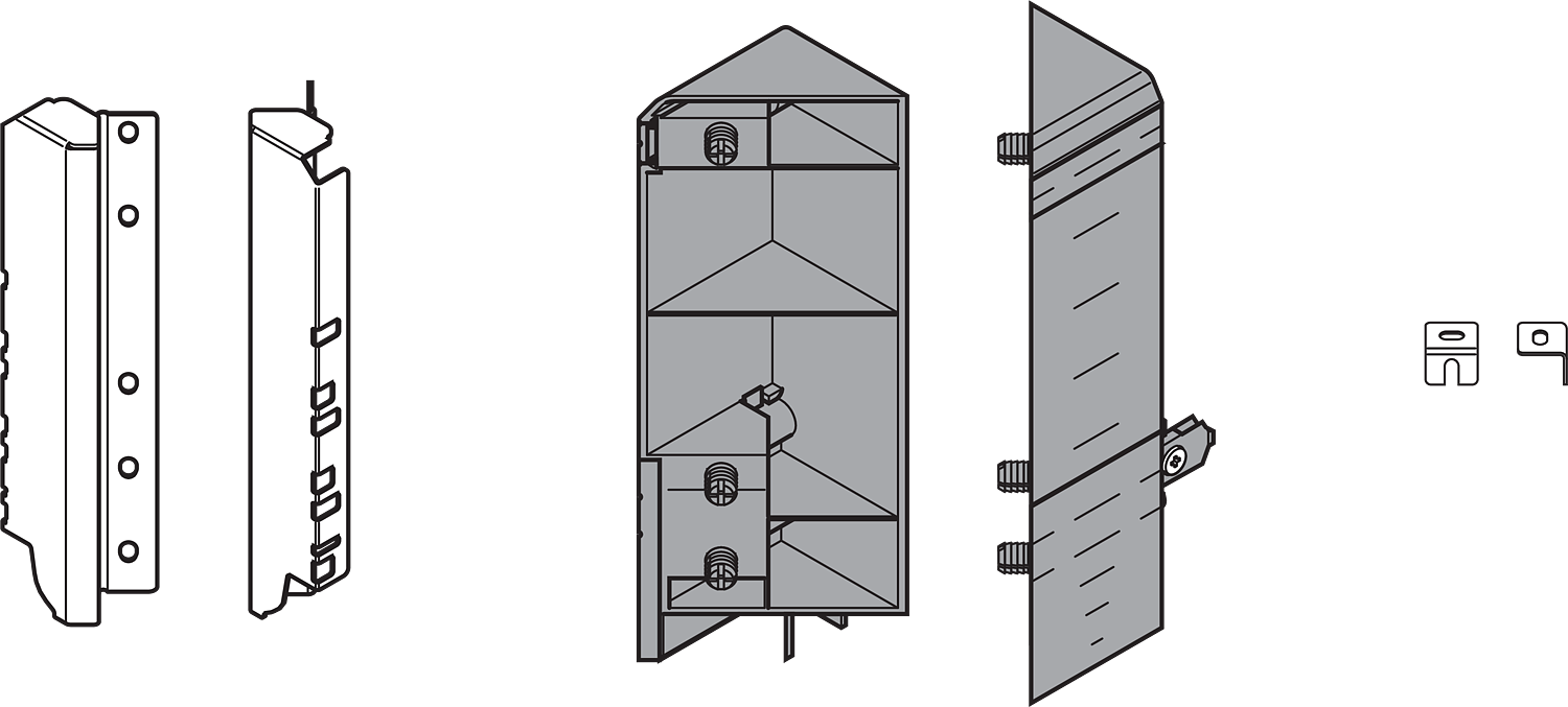 Ensemble de quincaillerie frontale pour la version ancienne du tiroir d'angle SPACE CORNER avec chants biseautés des façades. Pour hauteur de tiroir "D" (jeu minimal en hauteur du tiroir de 224 mm). L'ensemble comprend la quincaillerie frontale pour Space Corner avec façades fixes, supports arriere et équerres.