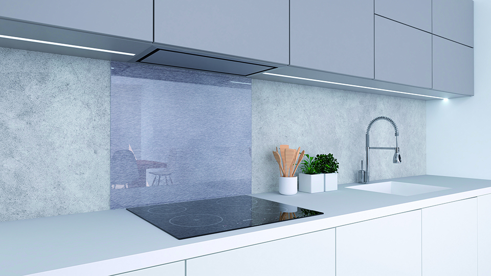 Crédence pour cuisiniere - revetement en verre finition effet aluminium brossé, en verre trempé d'une épaisseur de 5 mm.