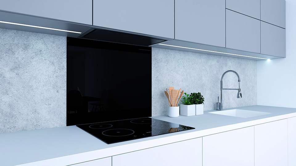 Crédence de cuisiniere - revetement en verre de couleur noire RAL 9005, en verre trempé d'une épaisseur de 5 mm.