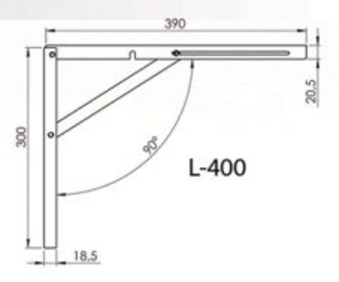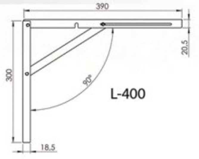 Console rabattable avec bras de 40 cm de long en couleur satinée (komaxit). Capacité de charge 100 kg/pair.