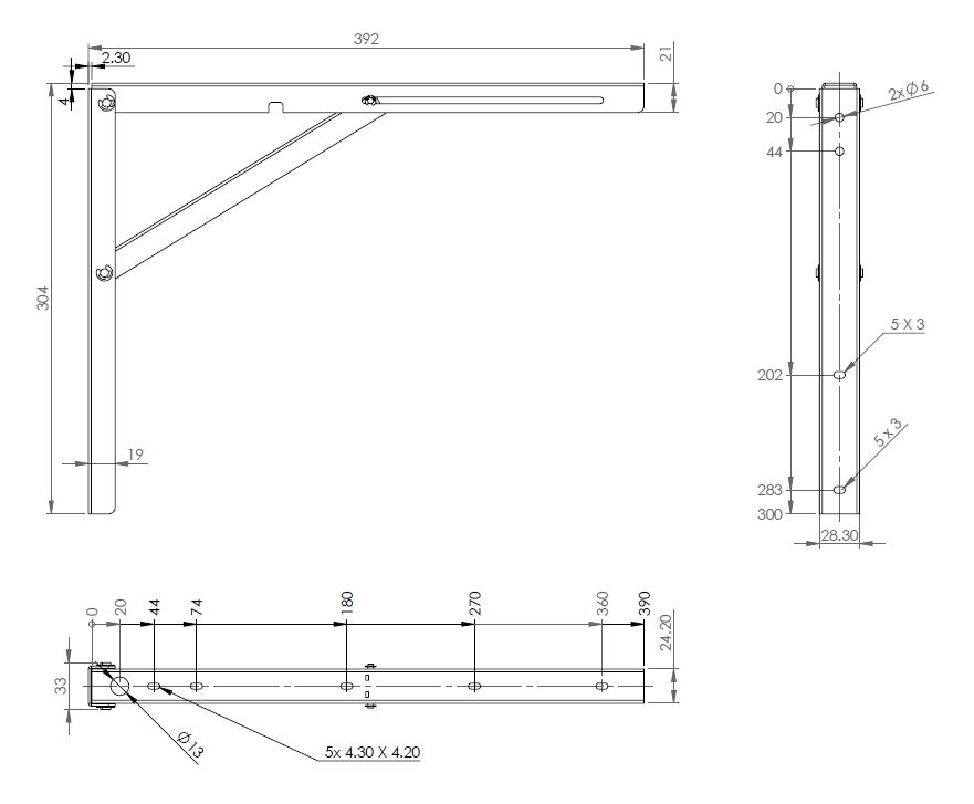 Avec tirant pour une capacité de charge accrue. Conforme aux normes de sécurité et de durabilité selon PN-EN 12521:2009 et PN-EN 15372:2010. La distance de l'étagere au mur en position totalement rabattue est de 30 mm.