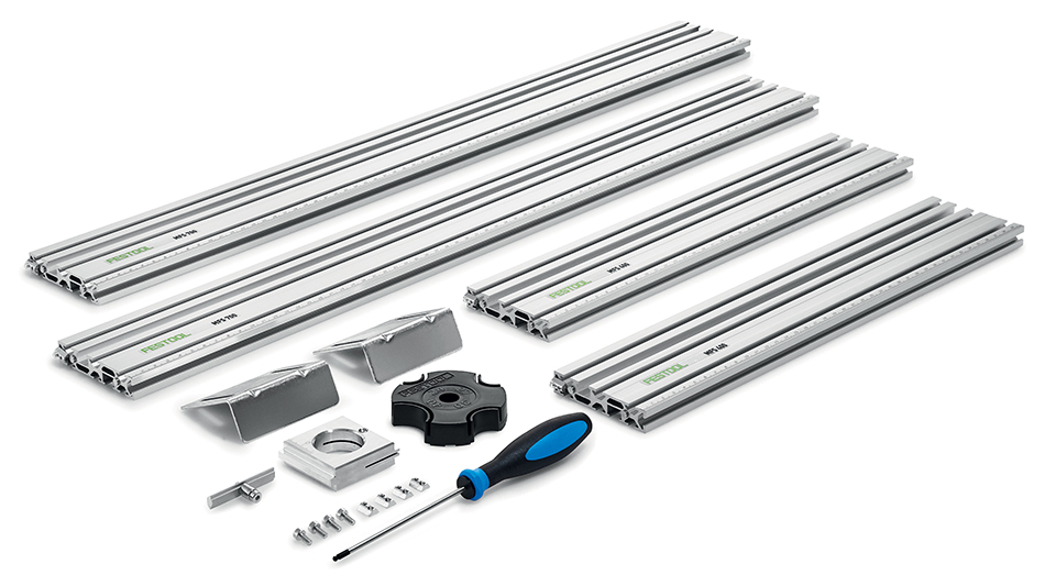 2 x úhlový doraz, ochrana proti překlopení, nástavec pro kruhovité frézování, šroubovák, v kartonu
