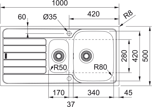 Éviers : 340 × 420 × 160 mm