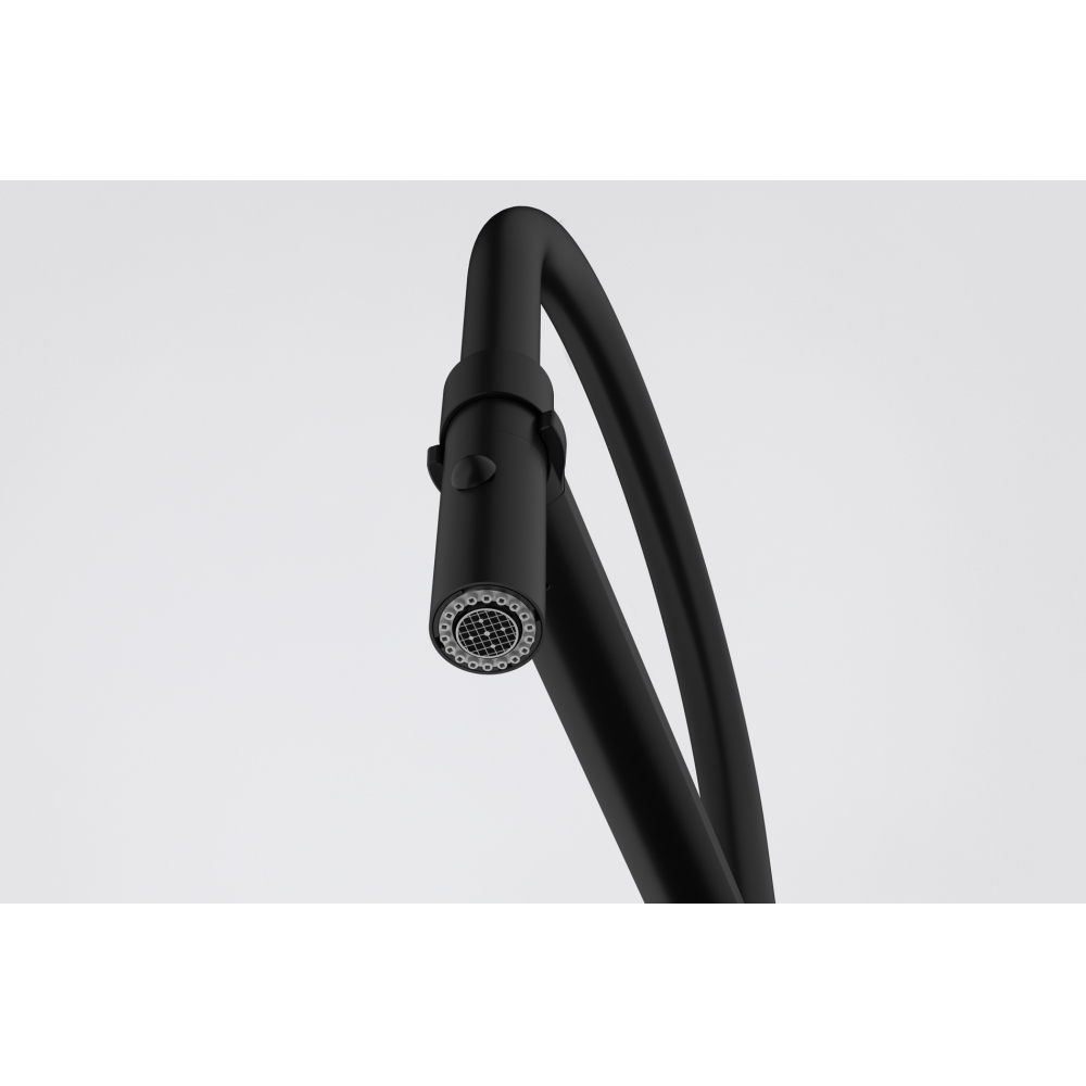 Robinet d'évier sur pied, finition noir mat (pulvérisation), hauteur 456 mm, aérateur sur ressort avec inverseur vers douchette, pour trou de 35 mm, rotation a 360°. Le robinet est livré avec tous les accessoires complets pour l'installation. Aucun achat supplémentaire n'est nécessaire. 115.0690.598