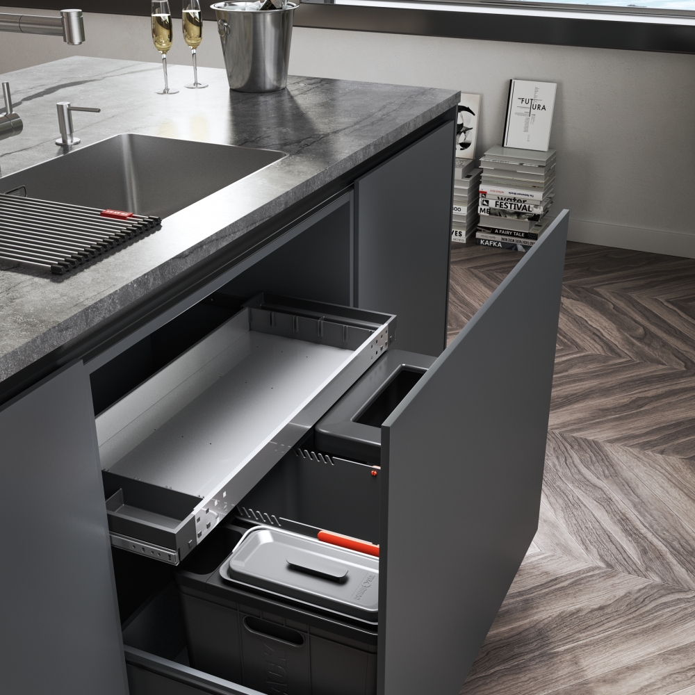 Le panier se place dans un tiroir coulissant a sortie totale, équipé d’un reling longitudinal ou d’une paroi haute latérale.