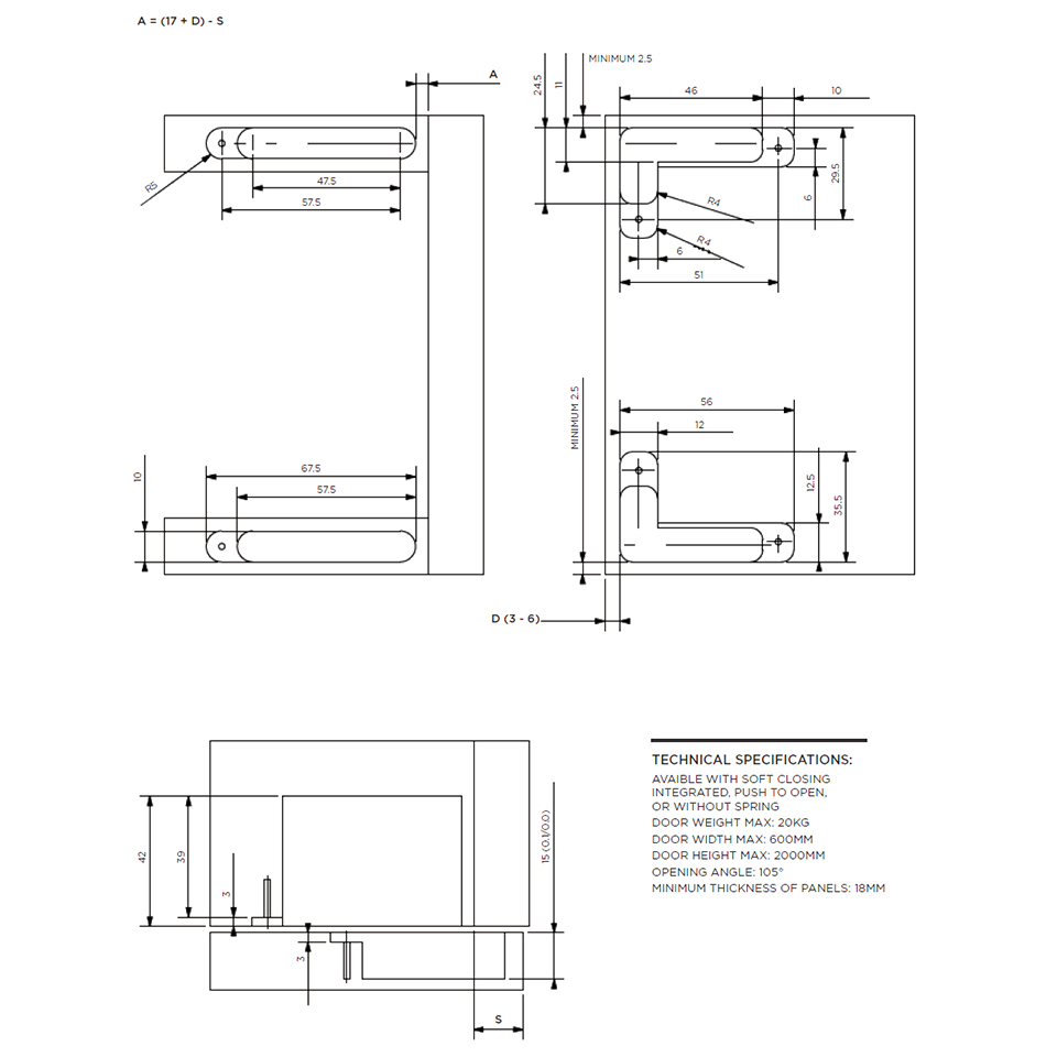 Design haut de gamme et tendance des charnieres. Finition nickelée. Excellentes performances. Charniere et bol fraisés dans la carcasse et la porte. Version avec amortisseur intégré. Capacité dynamique de charge 16 kg par paire. Angle d'ouverture de 105°. Possibilité de perçage a partir du bord de la porte K=3-6 mm. Épaisseur minimale du matériau pour fraisage 18 mm.