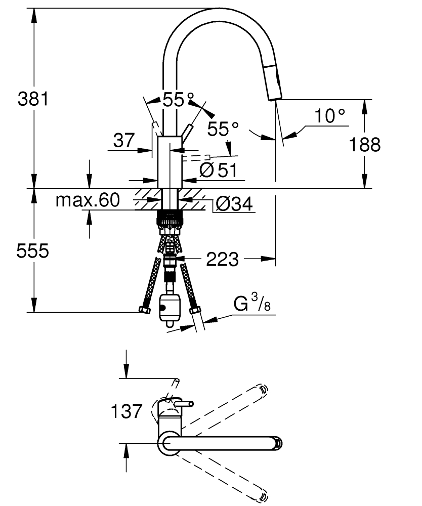 bec versement monotrou GROHE StarLight surface chromée cartouche céramique avec technologie GROHE SilkMove 35 mm GROHE EasyDock GROHE Zero conduite d'eau intérieure - sans nickel ni plomb douchette extractible Commutation duale : aérateur/jet de douche SpeedClean jet de douche réglable butée de débit bec pivotant angle de rotation 360° protection anti-retour flexibles de raccordement GROHE QuickFix systeme de montage rapide