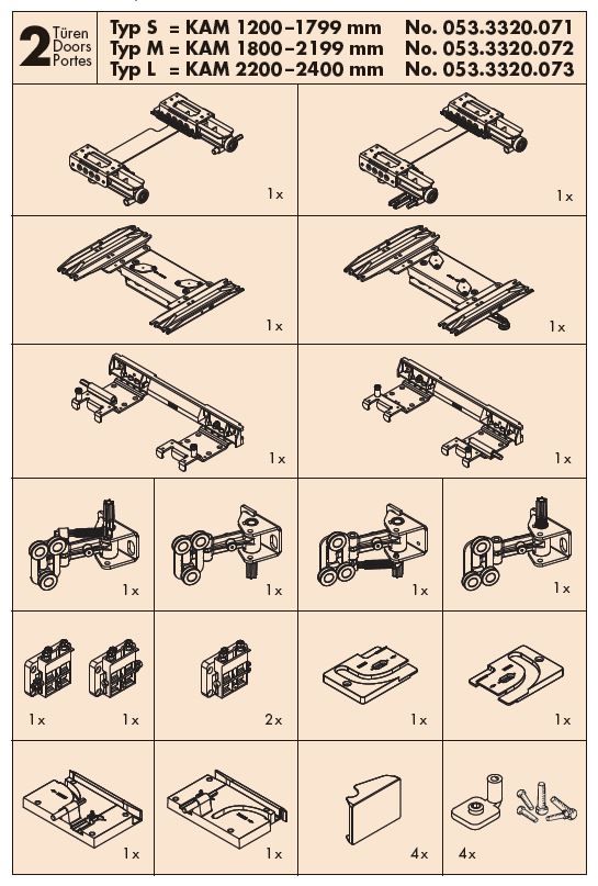 Ensemble de ferrures pour deux vantaux. Les profils doivent etre commandés séparément.