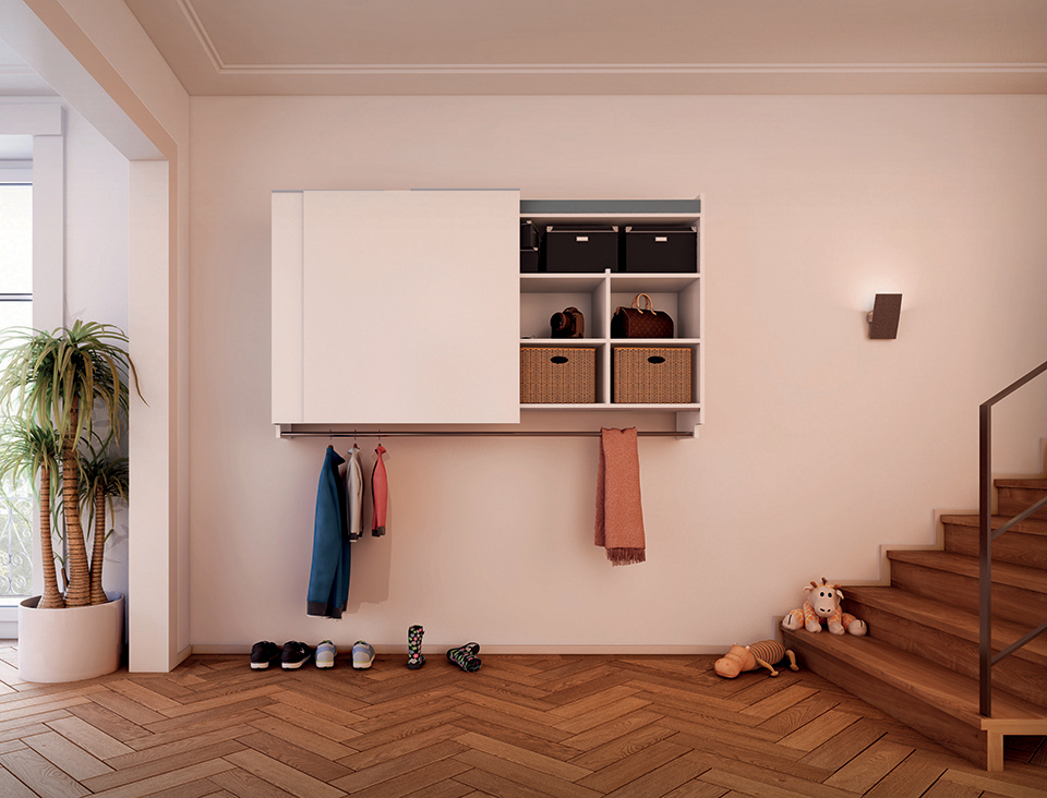 Ensemble de ferrures EKU pour deux vantaux dans un meme plan. Convient pour les armoires basses. Charge max. 20kg. Épaisseur du matériau 18 - 25mm. Largeur de l'armoire 1800 - 1999mm.