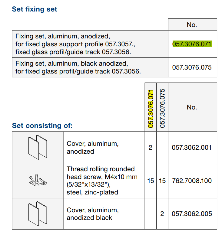 Ensemble de fixation pour profil porteur fixe en verre 057.3057. et profil "U" de guidage 057.3056. Aluminium anodisé.