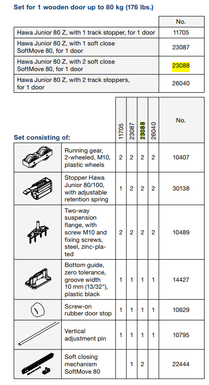 HAWA 23088 Junior 80 Z porte coulissante intérieure ensemble de ferrures 80kg 2x