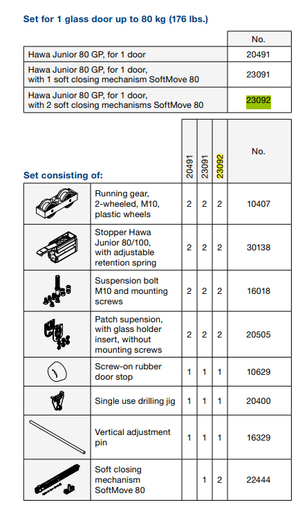 HAWA 23092 Junior 80 GP ensemble de ferrures pour portes en verre 80kg 2x amorti