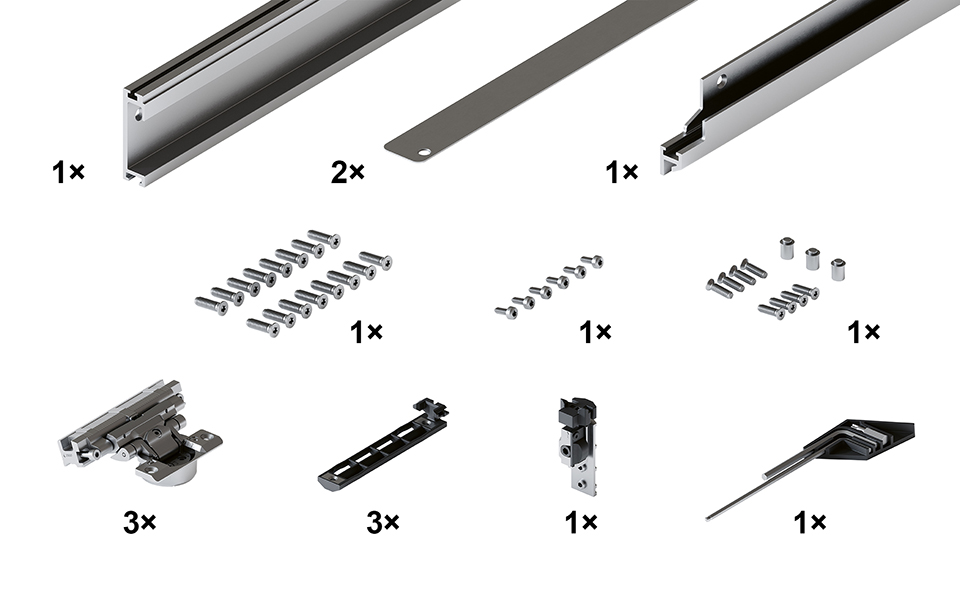 Ensemble de ferrures de base pour une porte a un vantail s'ouvrant aD pouvant etre rétractée dans une cavité. L'ensemble convient aux systemes Push et Pull, voir assortiment associé. Capacité de charge 6 - 25kg. Largeur du vantail 440 - 750mm. Hauteur du vantail 1220 - 2200mm. Épaisseur du matériau 18 - 26mm.