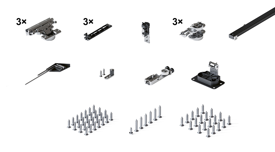 Hawa Folding Concepta III 20. Ensemble de ferrures de base Pull pour deux vantaux avec ouverture a droite et a gauche, pouvant etre encastrés dans une poche. Capacité de charge 6 - 20kg. Largeur du vantail 440 - 750mm. Hauteur du vantail 1220 - 2200mm. Épaisseur du matériau 18 - 26mm.