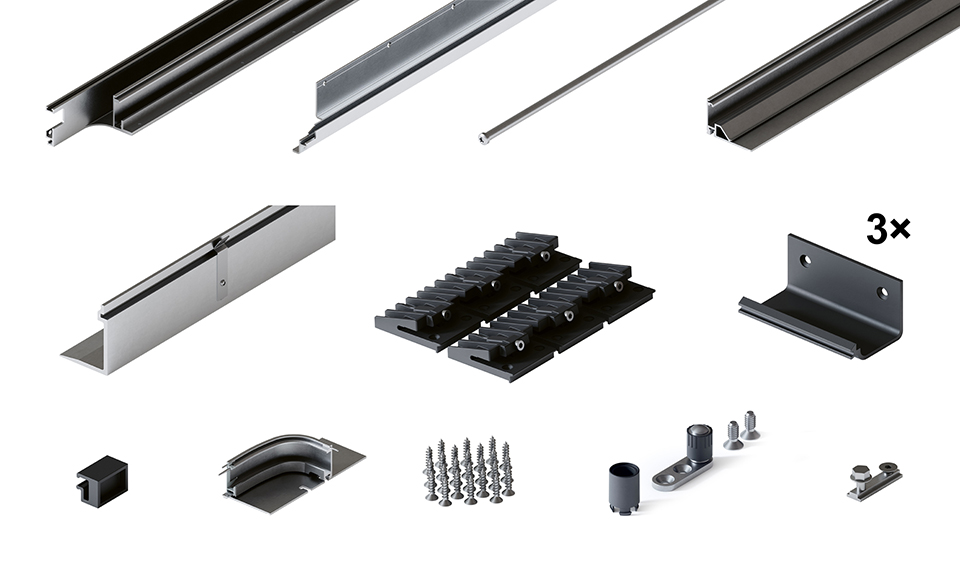 Hawa Folding Concepta III 20 droite + Concepta III gauche. Ensemble de guidage pour trois vantaux, argenté, matériau aluminium.
