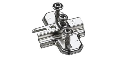 Rondelle de montage a visser Hettich Direkt. Entraxe des trous 32 mm. Vis préassemblée pour fixer le bras de charniere, tenons préassemblés et vis spéciales asymétriquement positionnées. Pour trous de diametre 5 x 7,5 mm. Trous ovales pour réglage en hauteur ± 2 mm.