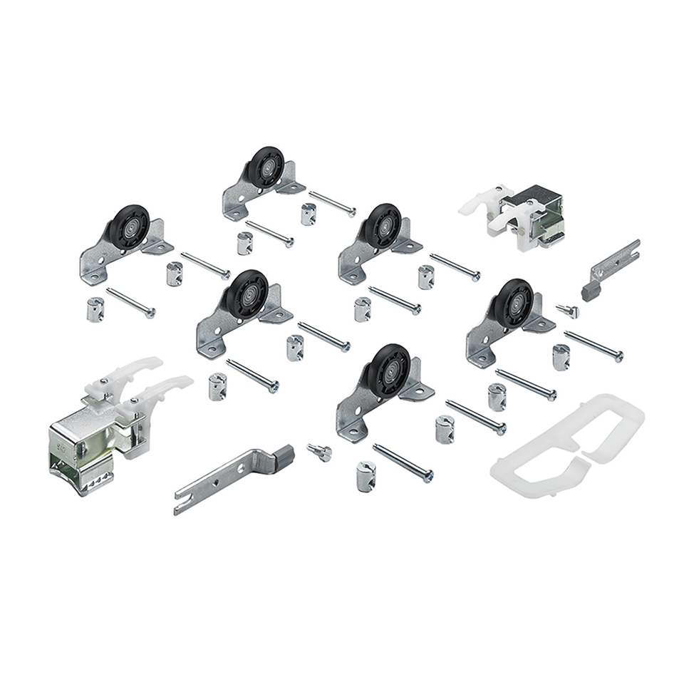 L'ensemble comprend les éléments supérieurs pour une armoire a 3 portes. Poids maximal des portes 50 kg. L'ensemble comprend : 6 chariots supérieurs, 2 butées d'extrémité pour profil porteur, 2 entretoises, 1 butée centrale. Matériel de fixation.