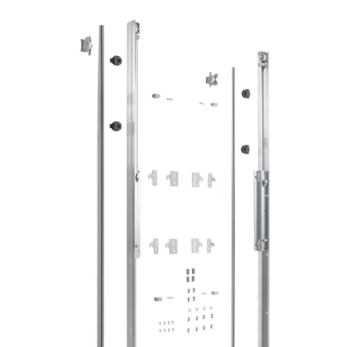 Quincaillerie pour portes coulissantes avec profils porteurs verticaux. Largeur de la porte max. 1500 mm, hauteur 400 - 700 mm.