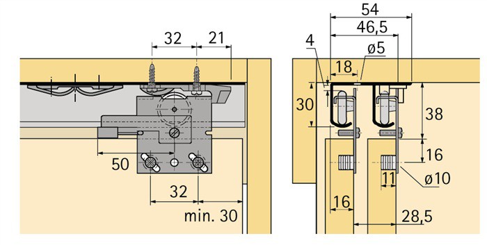 Profil porteur a 2 rails pour armoire a 2 ou 3 portes. Montage sous plafond, aluminium.