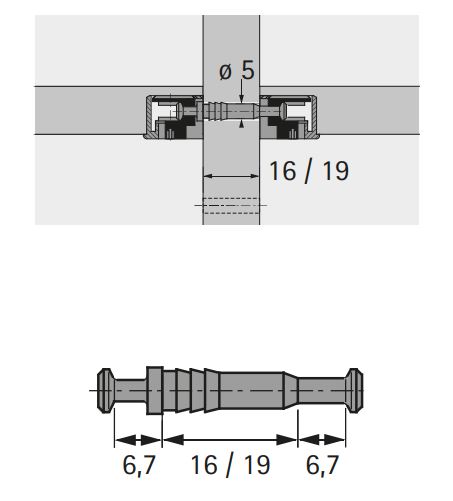 Pour cloison intermédiaire épaisseur 19 mm. Diametre de perçage 5 mm. Dimension de serrage 6,7 mm. Acier. Utilisable pour panneaux alvéolaires. Compatible avec System 32.