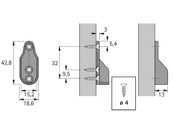 A visser avec 3 trous pour vis a bois, entraxe des trous 32 mm, moulage en zinc nickelé.