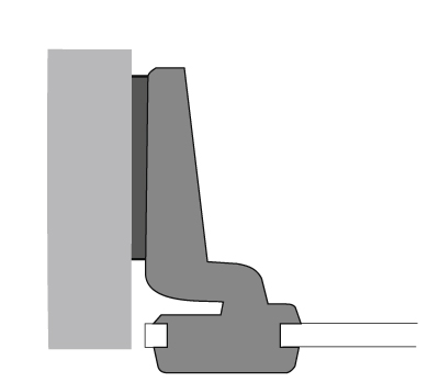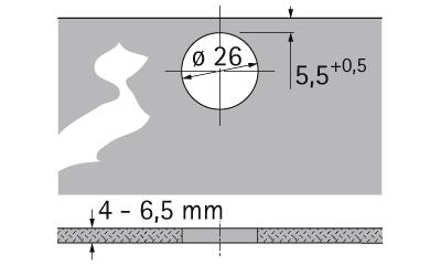 Charniere a godet a clipser insérée pour porte en verre ép. 4 - 6,5 mm, diametre du godet 26 mm. Rondelles recommandées : D1,5 vis a bois 106403 ; D1,5 euro 119240.