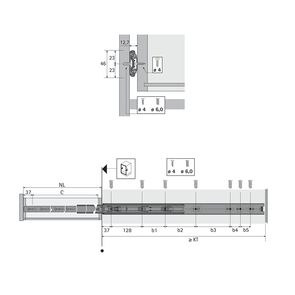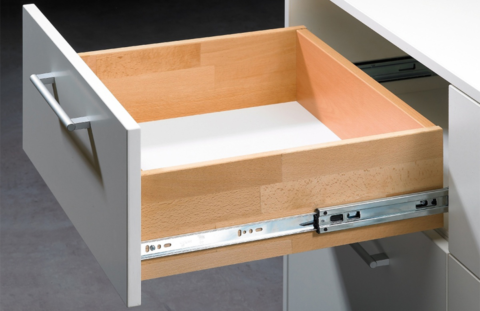 Sortie totale pour tiroirs en bois a billes, largeur de montage 12,7 mm, capacité de charge 45 kg. Avec butée et sécurité contre le déploiement accidentel. Grâce au levier, le tiroir coulissant peut etre séparé pour retirer facilement le tiroir du corps. Pour tiroirs avec fond en rainure, feuillure ou a champ D. Acier. Couleur noir