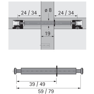 Dowel double pour cloison épaisseur 19 mm, avec verrou Seger, diametre de perçage 8 mm, dimension de serrage 39/20 mm, acier chromaté.