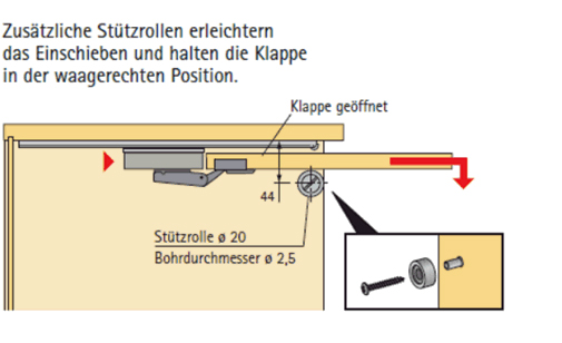 Avec l'ensemble accessoires KA 5740, il est possible de faire glisser la porte abattante vers le haut dans le corps de l’armoire une fois ouverte. L'ensemble accessoires facilite la coulisse et, lors de l’utilisation de portes abattantes, les maintient en position horizontale. L'ensemble comprend : 8 pieces butée de porte / piece d'espacement a emboutir, perçage de 10 mm. 4 pieces roue de support pour porte abattante de 20 mm. 4 pieces rivet de 6 x 10 mm. 4 pieces vis PanHead de 4 x 25 mm.