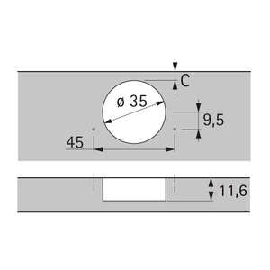 Charniere Sensys 8657i avec amortissement et débord nul, angle d'ouverture 165°, perçage du caisson 45x9.5mm, montage du caisson avec vis a bois.