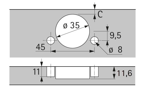 Charniere a clip sans amortisseur. Angle d'ouverture 165°. Épaisseur des portes 15 - 32 mm. Les portes ne chevauchent pas la lumiere du corps, l'espace intérieur est ainsi libre pour les éléments a tiroir coulissant. Entretoises recommandées : D 1,5 pour vis a bois 106403, D 1,5 pour euro 119240.