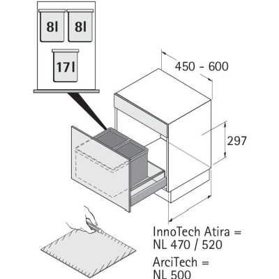 Pour l'installation dans un tiroir haut InnoTech de longueur 470 ou 520 mm, pour une largeur d'armoire de 450 a 600 mm. Volume 33 litres. Hauteur d'encastrement 297 mm. L'ensemble comprend : 3 pcs de bac avec couvercle 17 + 8 + 8 litres, 1 pc de tapis inséré. Le tiroir InnoTech se commande séparément.